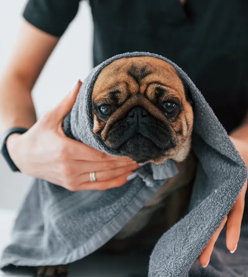 Cute dog wrapped in a towel